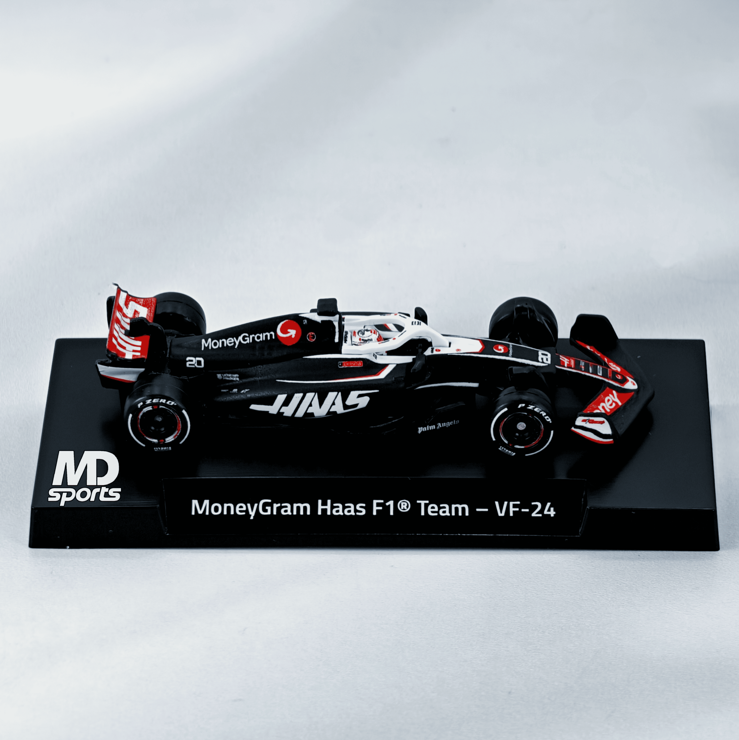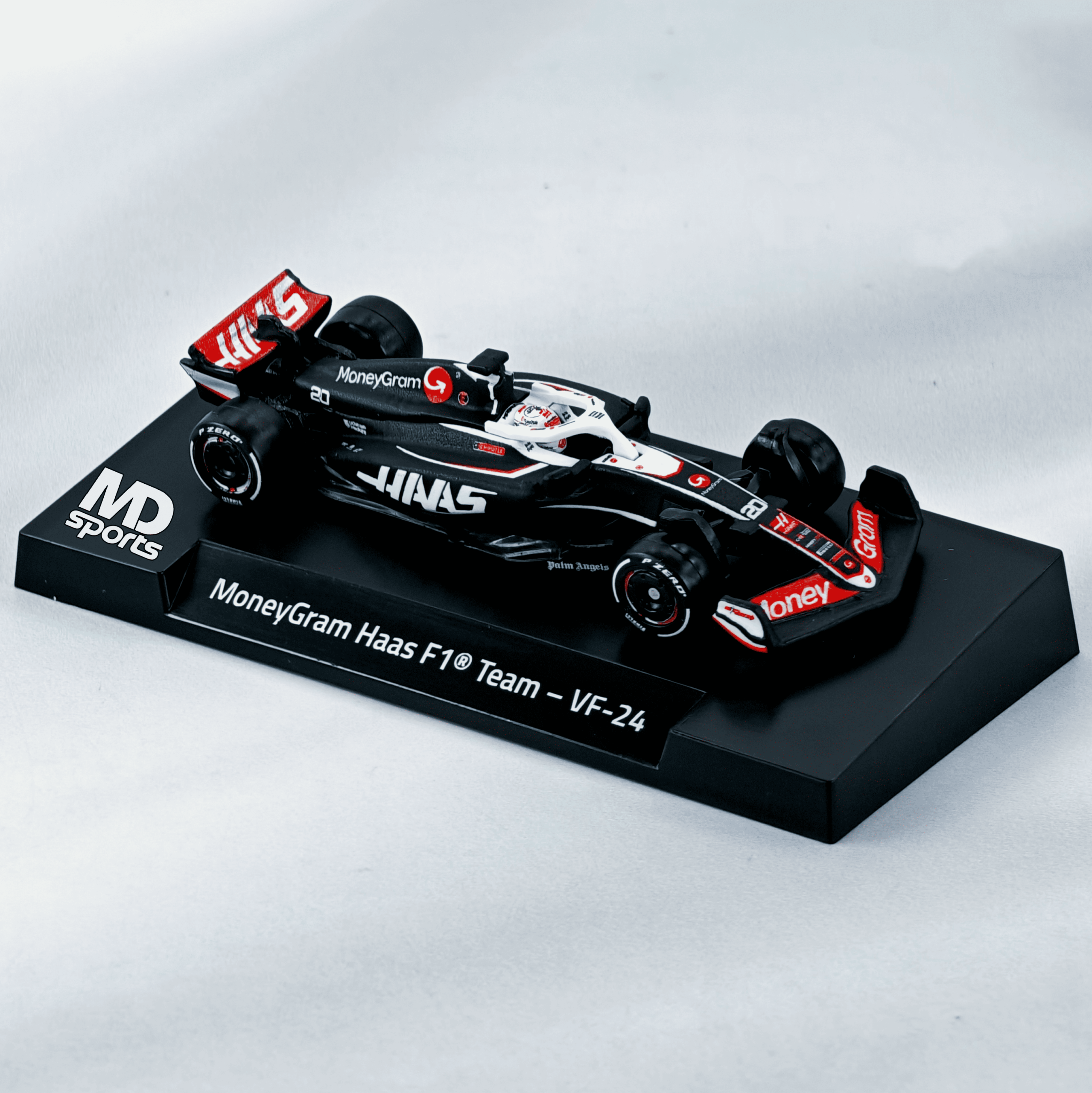 El Haas VF-24 de la serie Hot Wheels Premium es una réplica detallada a escala 1:64 del monoplaza utilizado por el equipo MoneyGram Haas F1 Team durante la temporada 2024. Este modelo cuenta con una carrocería de metal (ZAMAC) y chasis de metal, neumáticos de goma Real Riders con diseño de Pirelli y la decoración oficial en blanco, rojo y negro. Existen dos variantes principales según el piloto: el auto #27 de Nico Hülkenberg y el #20 de Kevin Magnussen, ambos presentados en un empaque especial que incluye una base de exhibición con el nombre del equipo.